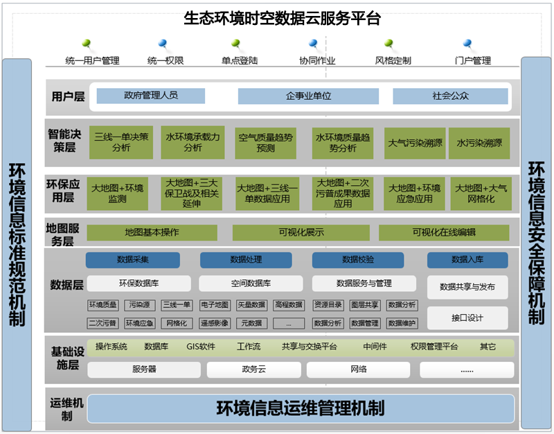 建立生态环境时空云服务平台,综合利用大数据、地理信息、“互联网+”等技术,将基础地理信息数据和环保业务数据进行结合,将平台强大的时空分析能力与环境业务相结合,实现空间+业务的可视化展示、环保综合应用、环境智能决策。