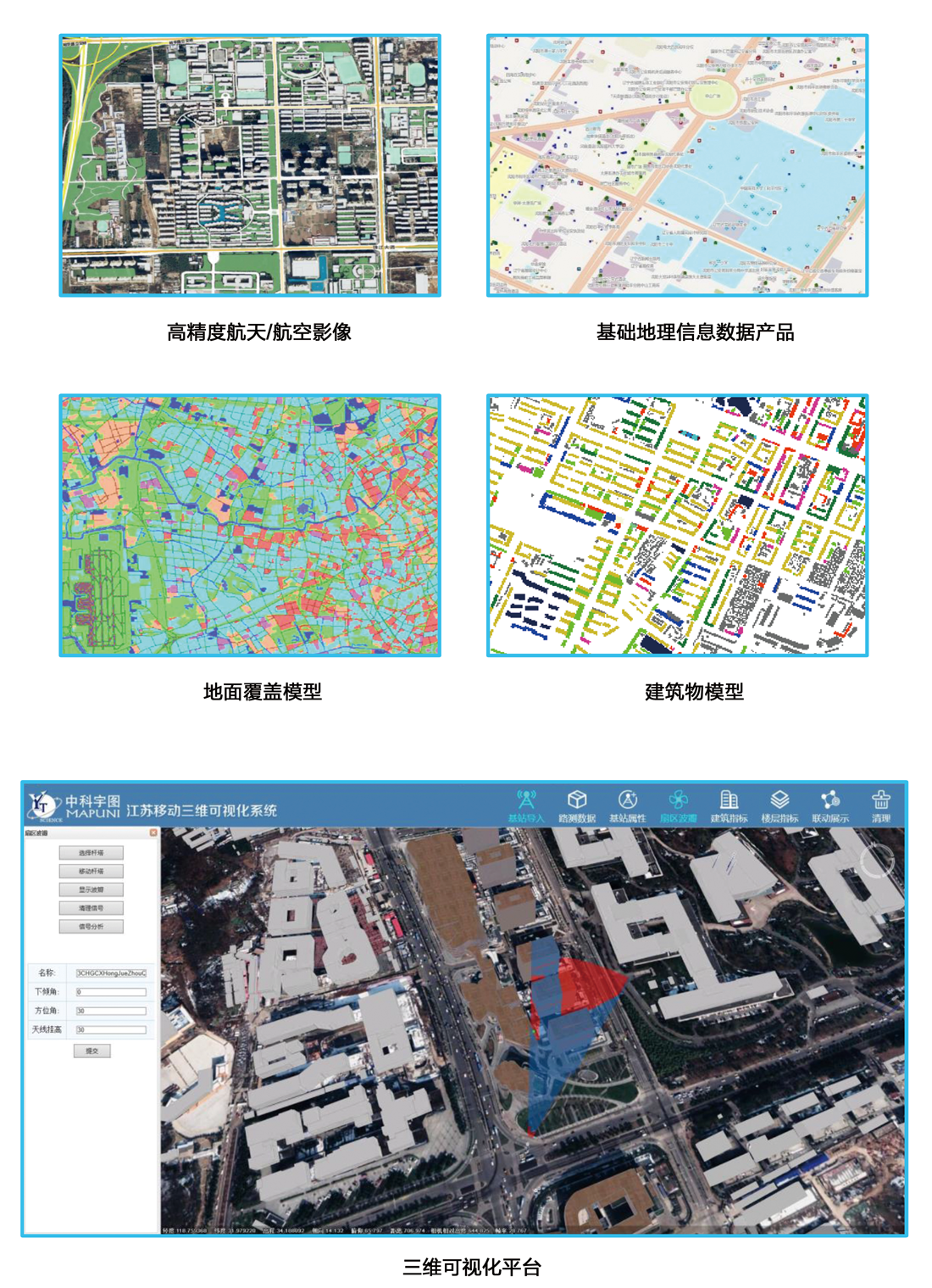 The product lines in this industry contain data products and software services, including high-precision electronic maps, multi-scale urban and rural basic spatial data products, wireless network optimization of 3D products, etc. These products are widely used in the business system of “integrated resources management system”, “network planning”, “wireless network platform” “channel economy”, “Broadband address resource display”, “Fault management system”,and “ service”. MAPUNI has independently developed a set of 3D visualization platform which integrates 3D visualization, 3D modeling, geospatial analysis, and base station analysis, which meets the user’s visual perception and application perception, supports the decision-making analysis of all level of leaders, and provides services for the operation and upgrading of the Communication industry.